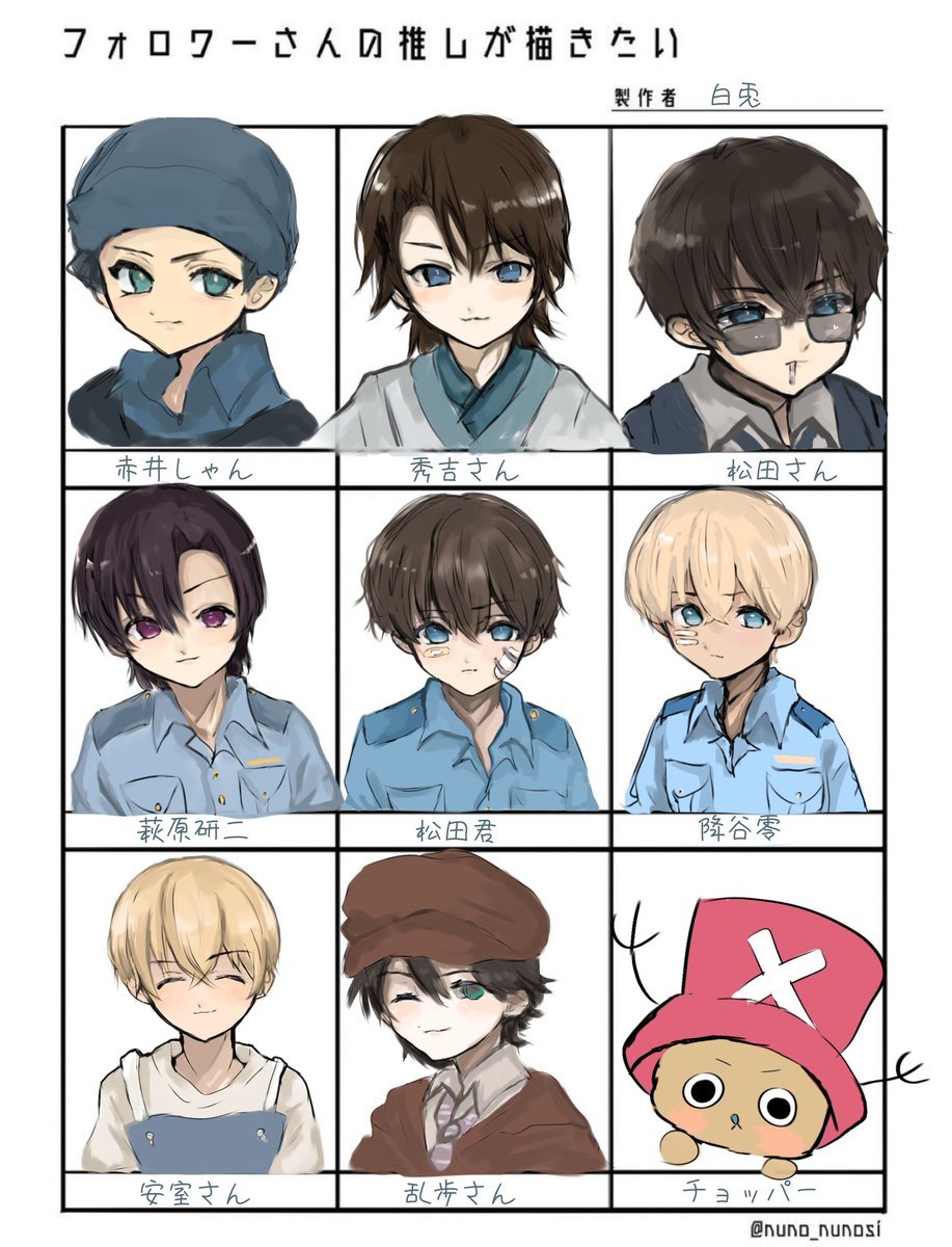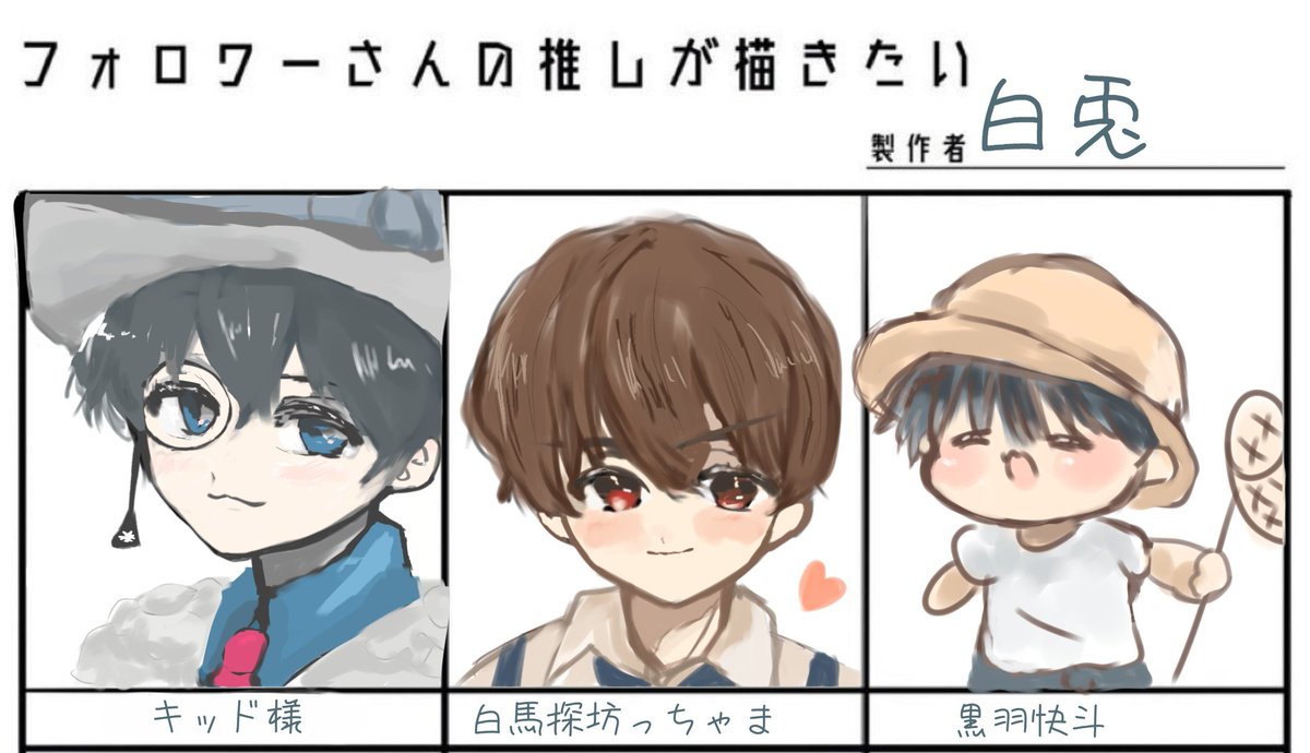 1 11 #フォロワーさんの推しが描きたい 2枚め完成✨✌︎(˶ ᷇𖥦 ᷆˵)✌︎ K様だけだと寂しいので 白馬君と黒羽君も描いたよ♡😊 22/07/27 22:05