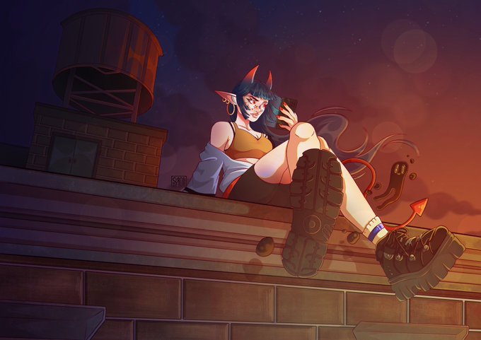Morgan & Ghosty chillin on the rooftop! I’m so so proud of this piece!! I think it’s one of my best work 💖 #art #artistsontwitter #OC #originalcharacter