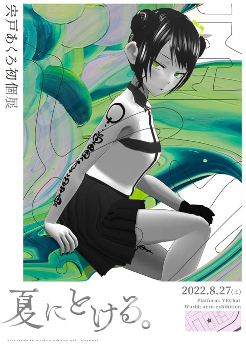🎟️開場のおしらせ🎟️ 日程:8/27(土)12:00~ 場所:VRCHAT ワールド名「Acro-Exhibition」 開きました! 下記リンクからINVITE MEのボタンできてみてください! onl.sc/SCMWtGa #個展夏にとける