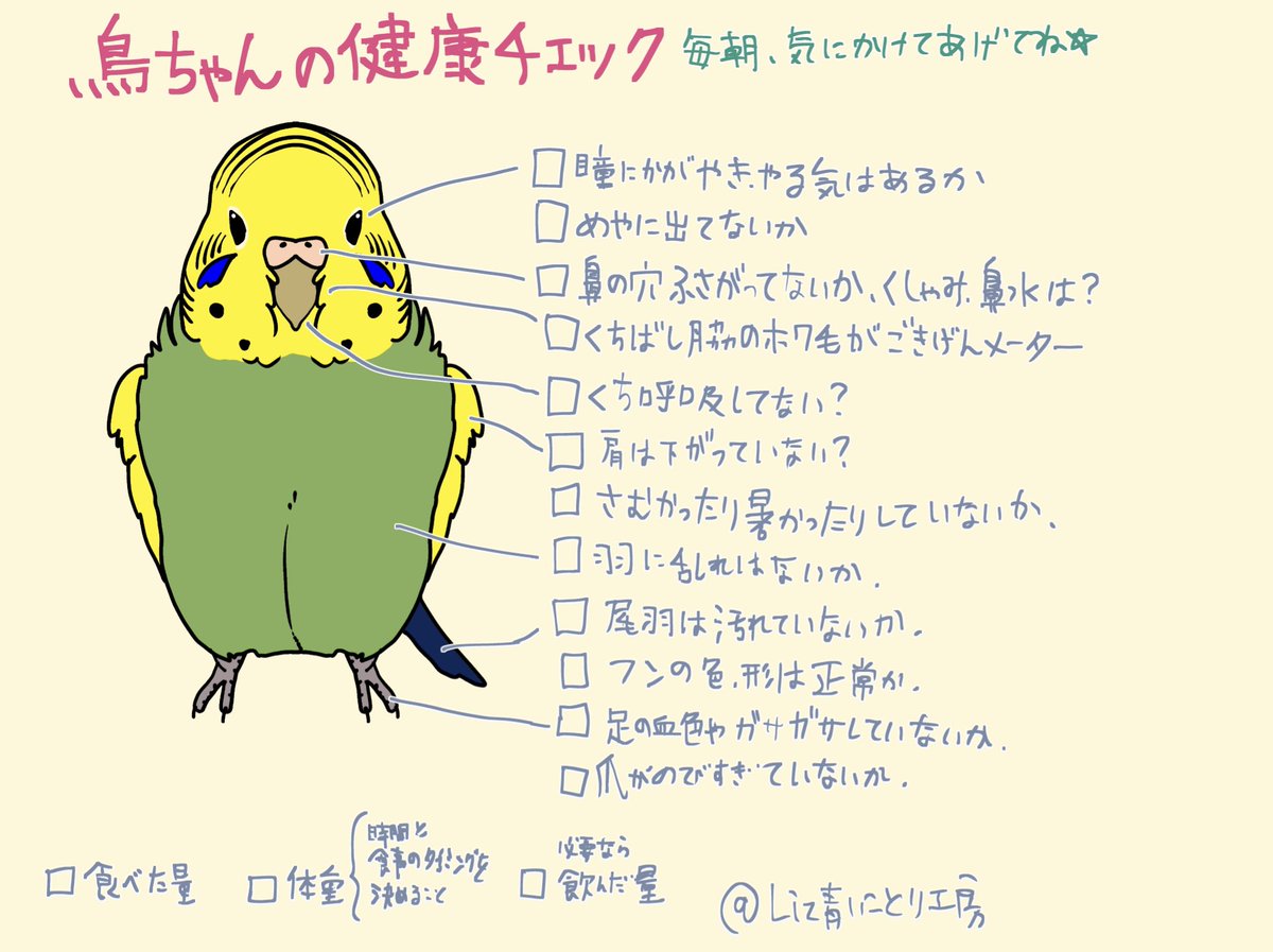 【拡散希望・おうちプリント🆗】 鳥沼Lizから、 鳥ちゃんの毎日の健康チェック☑️シート をプレゼント🎁 何かいつもと違ったら、なるはやで検診を。 寂しすぎて鬱状態になったり 退屈で毛引きを始めたりもあります。 どうか皆さんとパートナー鳥ちゃんとの生活が 毎日楽しくて輝きますように✨… twitter.com/i/web/status/1…