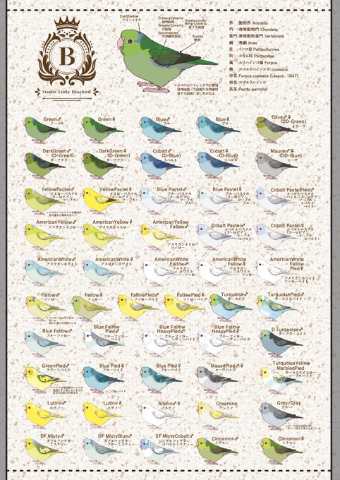 マメルリハの日ということで、図鑑風タペストリーのマメちゃんズをば🥰 国内にいない品種もいますが、海外の愛鳥家さまやブリーダーさまなどのご協力もあり、ほぼすべての子にモデルがいます🌟… twitter.com/i/web/status/1…