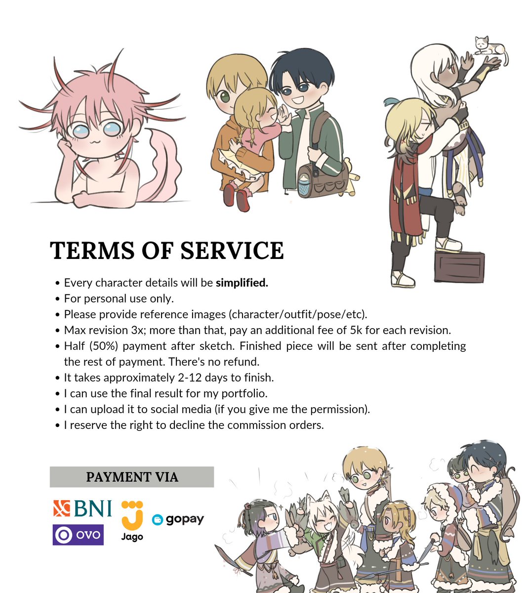 [Siyanida Open Commission] Hai! Aku sedang open commission buat bulan ini (Indo only🇮🇩) Silahkan liat-liat ketentuannya di pics, ya:D Kalau tertarik dan mau tanya-tanya dulu, boleh banget DM ke sini🤙 Likes & RTs are very appreciated 💕 @CmsnArtist_Id #opencommissions #artidn
