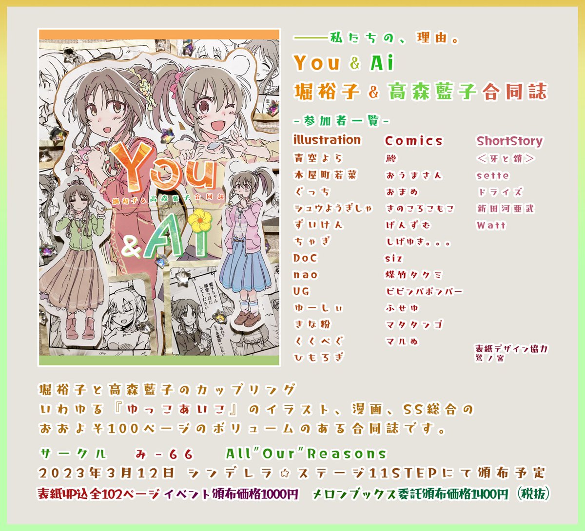 99 167 告知です。 ゆっこあいこ合同誌の概要です。 また完成次第改めてご報告致します。 #ゆっこあいこ合同 #YouAndAi #cin_stage #シンステ 23/02/19 23:38