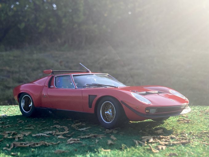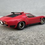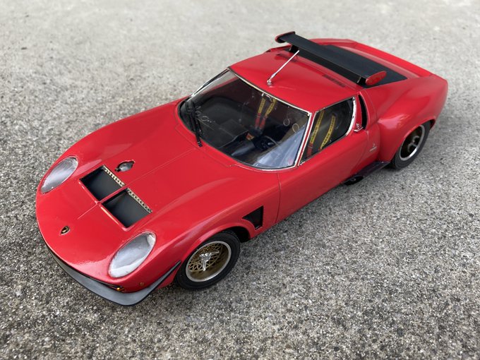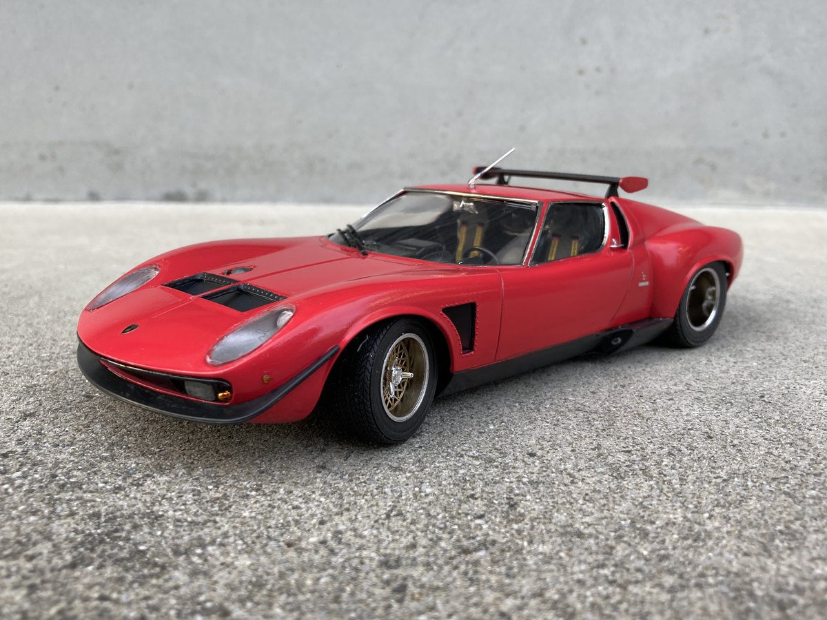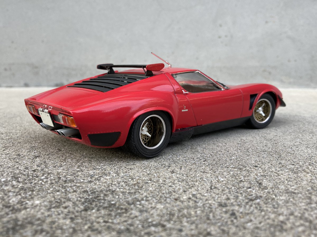 ハセガワ 1/24 ランボルギーニ イオタ、完成しました。 製作期間7日(途中休みあり)。主にラッカー系塗装です。窓枠のメッキにはハセガワのミラーフィニッシュを使用しました。