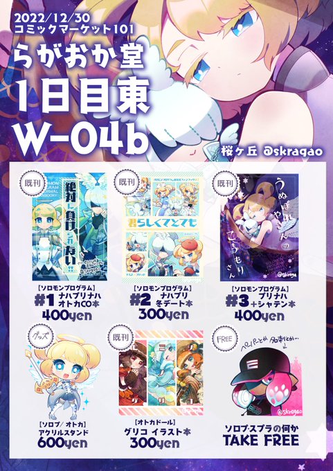 【お品書き】12/30(金) 1日目東【W-04b】 ソロモンプログラムのナハスとプリッドの本3冊 無配でスプラの名刺とかペーパーとか出したい🦑 Webカタログ→【webcatalog-free.circle.ms/Circle/16817142】 #C101 #C101お品書き