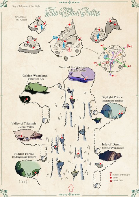 「風の街道」のマップ 以前描いた、2枚の地図を一枚に纏めました。 キャンドル数も記載 Wind Paths Map Season of Flight #thatskygame #SkyChildrenOfTheLight #sky星を紡ぐ子どもたち #sky地図 #羽ばたく季節 #風の街道