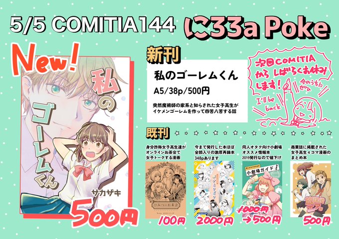 5/5 #COMITIA144 のお品書きです。東1ホール に33a Poke 新刊は、突然魔術師の家系だと告げられた女子高生がイケメンゴーレムを作って四苦八苦する漫画「私のゴーレムくん」38p/500円。既刊も4種持っていきます。今後しばらく直接参加できないので今回のうちにぜひ! #コミティア144お品書き
