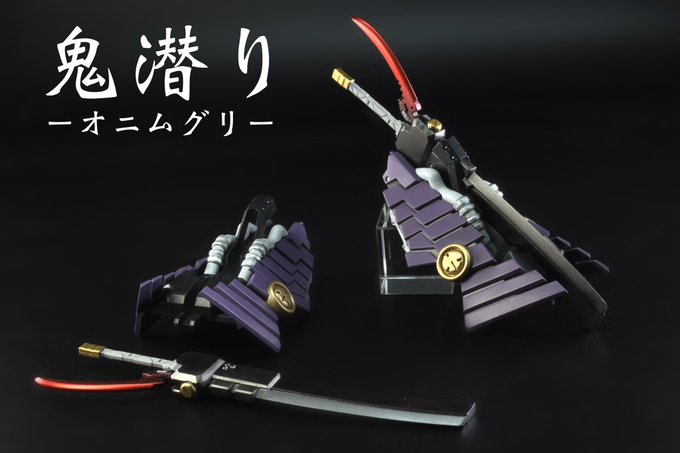 @BISAION さんの3Dプリンター出力品 『鬼潜り(オニムグリ)』 『鬼切丸・神楽』 塗装させていただきました! 3Dパーツ特有の積層跡がほとんど目立たなく、表面処理が楽でした 秋葉原の「いのう商店」さんで販売中です!