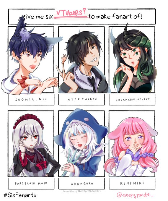 I started this forever ago but #SixFanarts vtuber style!! @Soomin_Nii @HydeTweets @DreamlikeMelody @PorcelainMaid @gawrgura @Rinimiki
