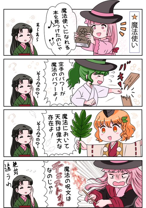 【かごんまおごじょ!4コマ漫画】 04 「魔法使い」 毎週火曜日の17時に投稿! 一体どこの魔法使いの集団なんだ #かごんまおごじょ #4コマ漫画 #イラスト好きな人と繋がりたい #絵描きさんと繋がりたい #漫画が読めるハッシュタグ #薩摩ホグワーツ
