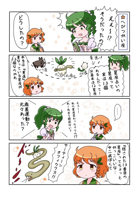 【かごんまおごじょ!4コマ漫画】 05 「へびつかい座」 毎週火曜日の17時に投稿! 隠された星座、それが「へびつかい座」 #かごんまおごじょ #4コマ漫画 #イラスト好きな人と繋がりたい #絵描きさんと繋がりたい #漫画が読めるハッシュタグ #へびつかい座 #星座