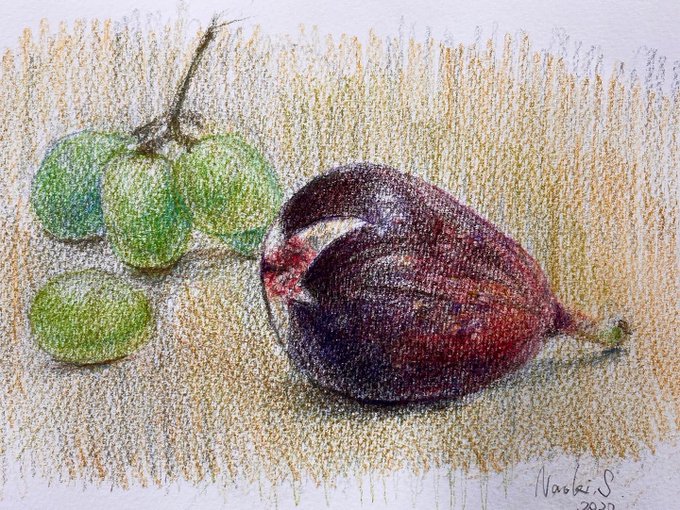 1 27 本日のモチーフ #いちじく #マスカット #色鉛筆 #スケッチ アリオ八尾2階 セブンカルチャーに展示中 22/08/26 14:34