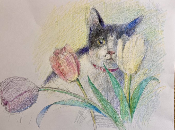 今日の #スケッチ #ネコ #色鉛筆 #チューリップ