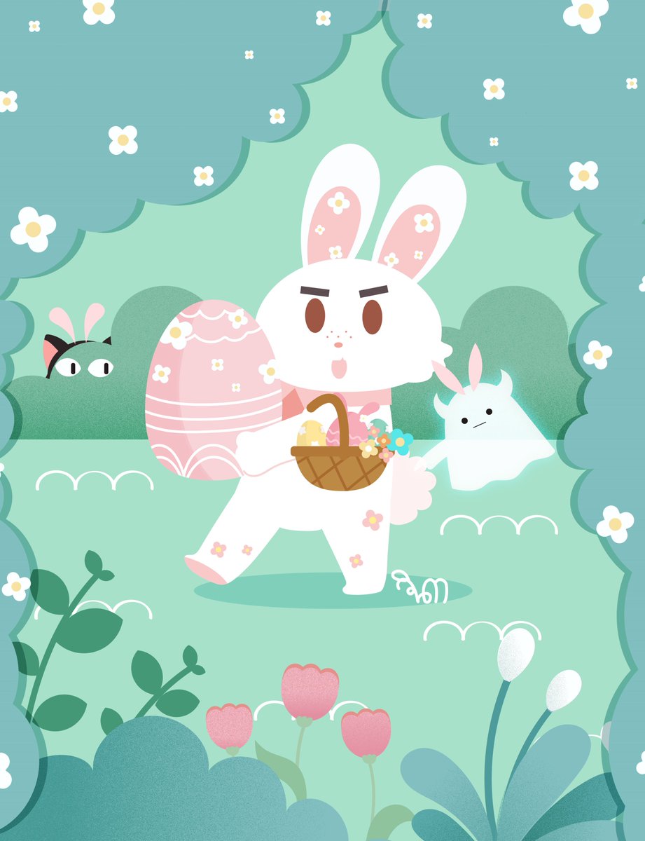 happy Easter 💐🐰"เจ้ากระต่ายดอกไม้เซบาสเตียน กำลังง่วนอยู่กับการแจกไข่อีสเตอร์ จนลืมสนใจสิ่งรอบข้าง มันกำลังโดนสะกดรอยตามจากใบไม้ลอยได้ และพุ่มไม้มีดวงตาอยู่" #Easter2023 #illustration #SandyTheWitch