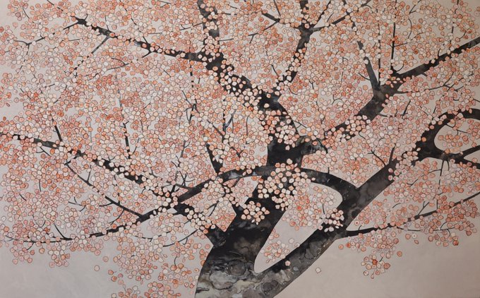 20 185 酔(2023) 本日より展示です。よろしくお願いいたします。 #絵画 #日本画 #art #雀 #芍薬 23/04/03 10:00