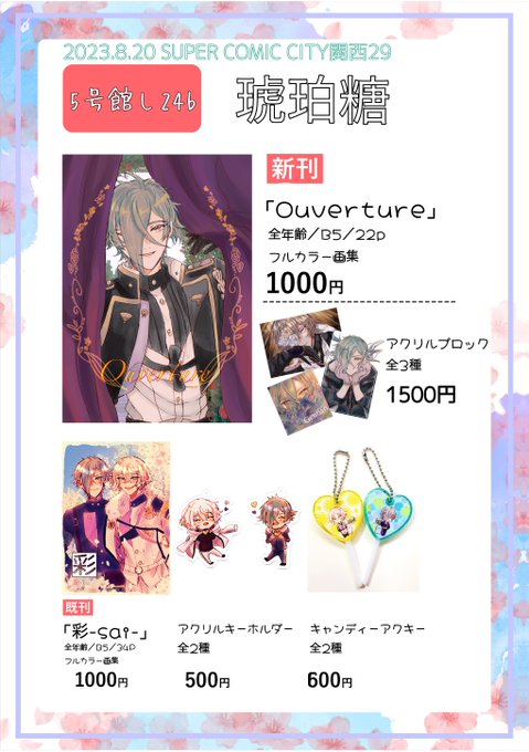🌸お品書き🌸 2023/08/20 SUPER COMIC CITY 関西 29 超閃華の刻2023夏 5号館 し24b 【琥珀糖】 あまぎちゃん( @amagi_wolf )と合同スペースで参加です🥰🙌 当日翠華ちゃん( @S_ka_cos )が五虎退でお手伝いくださいます! よろしくお願いします🙇♀️✨️