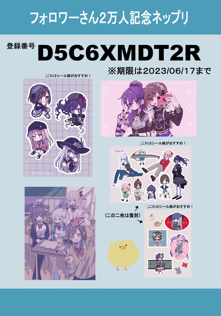 62 297 【フォロワーさん2万人記念ネップリ】 今日から6月17日までローソンorファミマで印刷可能です! 印刷報告お待ちしております…!🥹 (※イラストが途切れてしまう可能性があるので「枠あり」の印刷をおすすめします) 23/06/03 15:00
