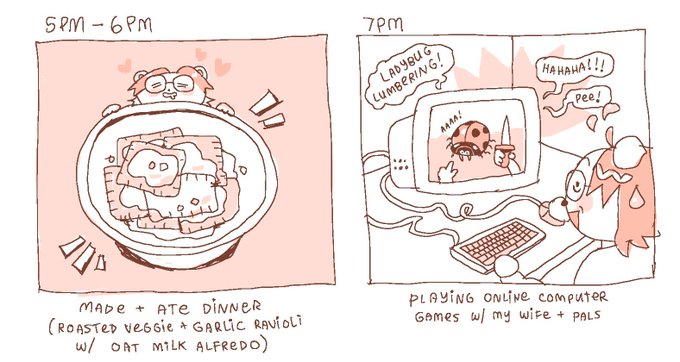 :o) vibeogames and ravioli after worky! #HourlyComicDay2023 #hourlycomicday (whupsy forgot to tag the others heehee)