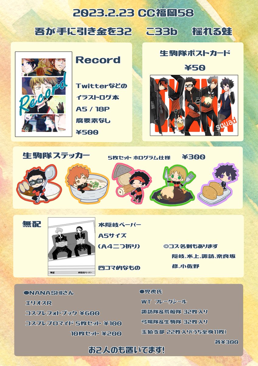 2/23 CC福岡58 吾が手に引き金を32 こ33b 揺れる蛙 みずおきスペですがいこまたい要素強めです! NANASHIさん、児虎氏のも置いてます~!遊びに来てくださると嬉しいです☺️ 私は隠岐のコスプレしてます~!