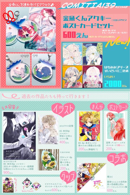 #COMITIA139 お品書き♥️I.25ab 🌟相方の霞夜ちゃん@x_tttt_0 と一緒です! 新作は金魚アクキー&ポスカ🧜♂️✨ 色紙もあります!既刊も沢山!!残ったものはBOOTHで販売予定です。 #コミティア139 #お品書き