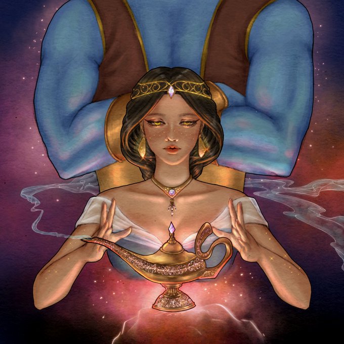 #콕카인_디즈니공주_흑화_합작 자파에게 사랑하는 가족과 애인을 잃고 직접 램프를 훔쳐 지니를 소환하는 타락한 자스민