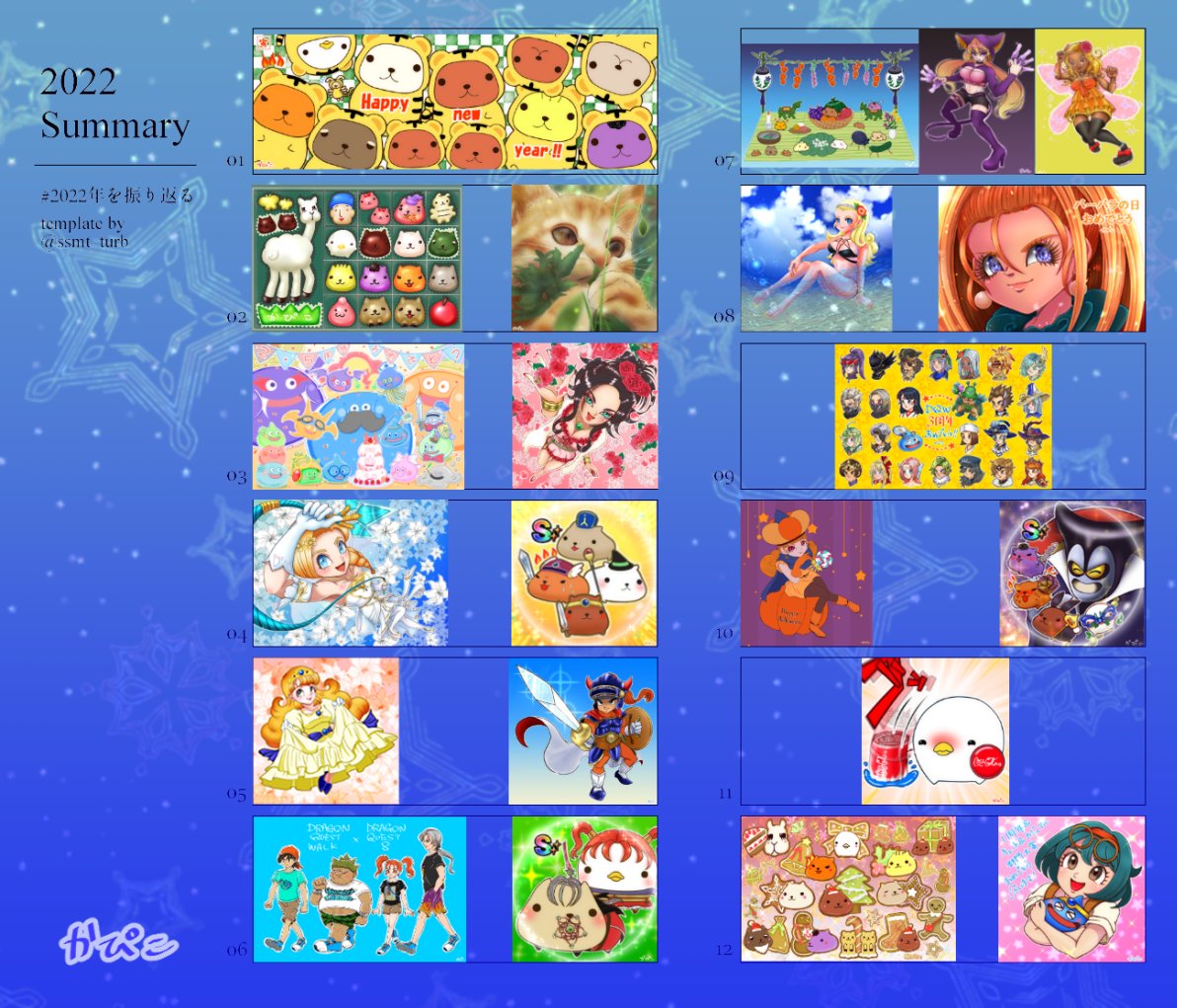 #2022年自分が選ぶ今年の4枚 花嫁装備一式を描くのに挑戦した「ビアンカの日」👰 主人公全員をSDで描いた「ドラクエの日」🎊 過去の攻略サイトを見ながら描いた「DQW3周年」🎂 クリスマス深夜に描いた「クリスマスと猫」❄🎄🐈