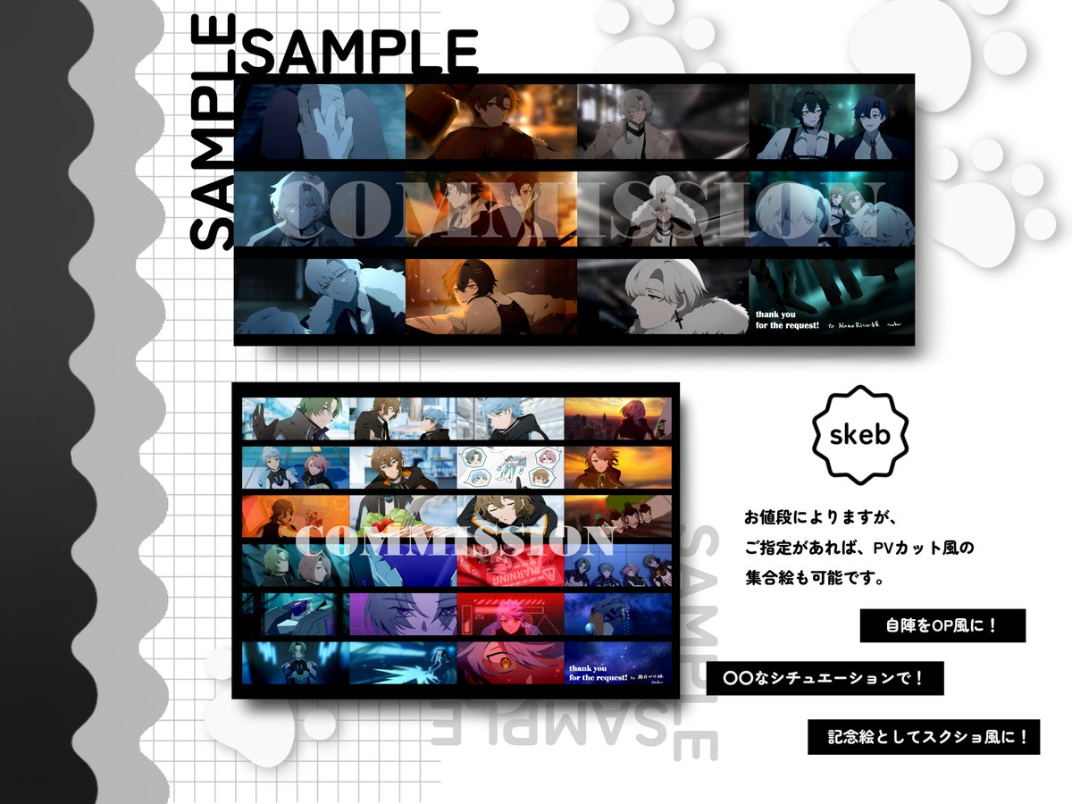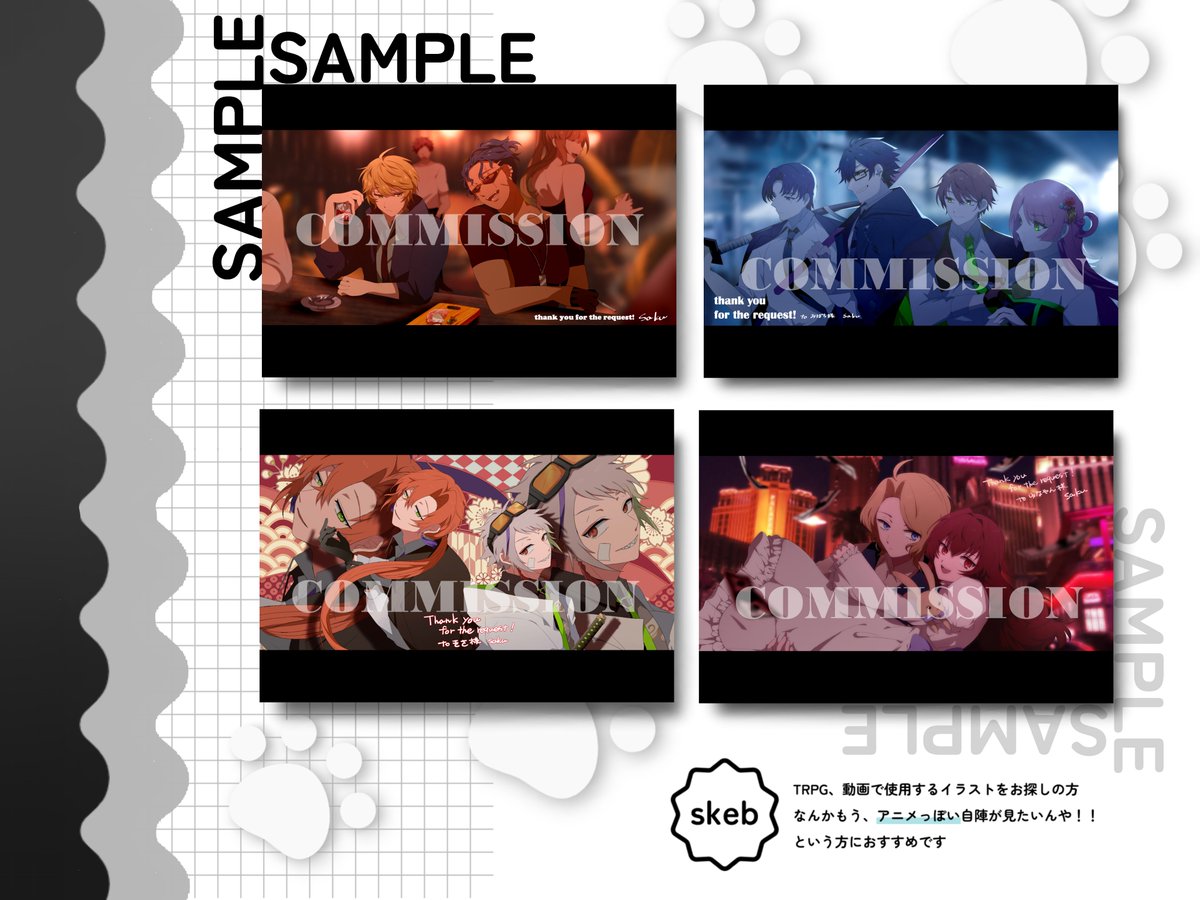 ❏ skeb依頼 ❏ なんちゃってアニメスクショ風のイラストを描きます!👐 ・基本を画像1枚目のようなアニメスクショ風一枚絵 ・ご指定があれば、画像2枚目のような集合絵 【skebリンク先】 skeb.jp/@so_sakusakupan