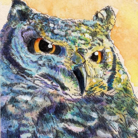 #ゴールデンウィークSNS展覧会2023 フクロウをペンと水彩で描いてます!!!!!!虹色感伝われ!!!