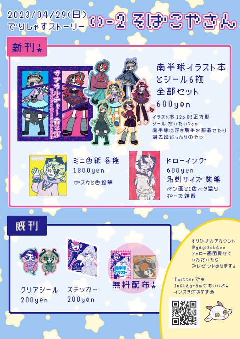 #ななしいんくオンリー お品書き更新しました! 🌎いー2 そばこやさん!真ん中の方 🌎本とシール6枚ぜ〜んぶセット! 🌎悪魔の600円っておぼえてね! 🌎オリ垢 @yagisobaco フォローでプレゼントあります!(インスタがおすすめ) ⚠️スケブは行いません ⚠️サークルスペースの撮影はご遠慮ください