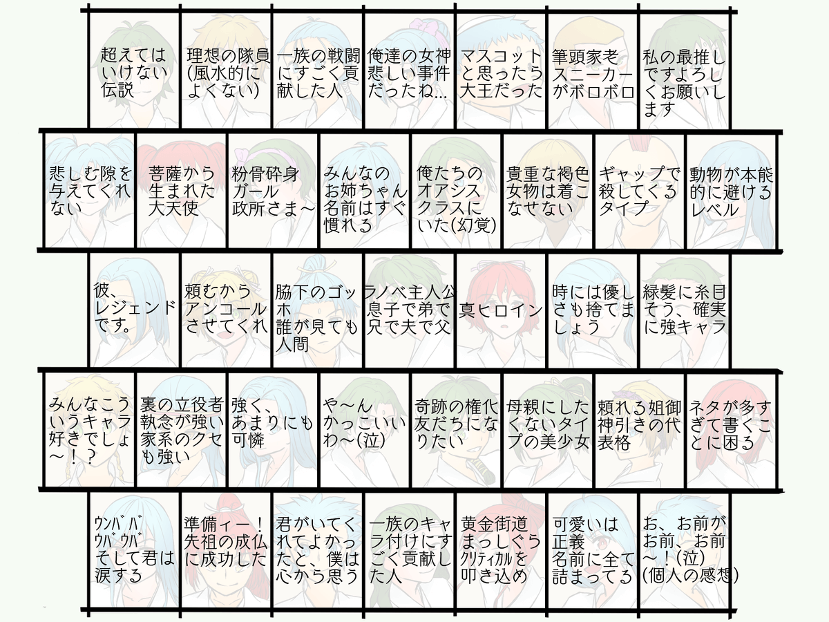 22 31 私が描いた一族一覧。 好みの見た目の子を見つけてからの方が興味を持ちやすい方用。ネタバレを極力避けるために並びは順不同。 2枚目はネタバレになるようでならないようでなるような私のコメントです。 19/12/01 21:20