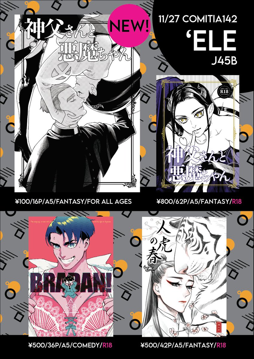 11/27 COMITIA142のお品書きです! 新刊は「#神父さんと悪魔ちゃん」Twitterまとめの全年齢コピー本です!📚 サンプルはツリーをご参照ください🙇 西1J45b「’ELE」でお待ちしてます✨🙌 #COMITIA142 #コミティア142
