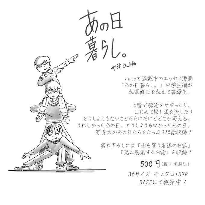 色々な人の協力を経て 無事「あの日暮らし。中学生編」 書籍になりました! 小学生編を読んでない方も ツイートしか覗いていない方も この機会にぜひ! 渾身の一冊です!! 下記から購入可能です! sohcomicshop.thebase.in/items/62442429 何卒、よろしくお願いします!! #漫画が読めるハッシュタグ