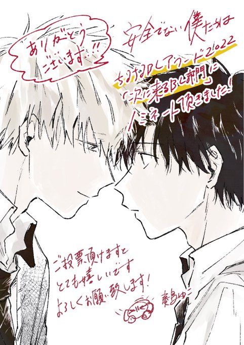 #BLアワード2022 にて 「安全でない僕たちは」が次に来るBL部門14位をいただきました!🎊 いただいたコメントも全て拝読させていただきました🥲ご投票くださった皆様、読んでくださった皆様、本当にありがとうございます…!!今後も精進いたします!