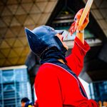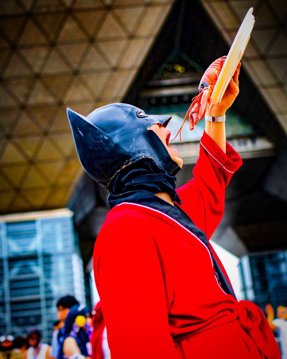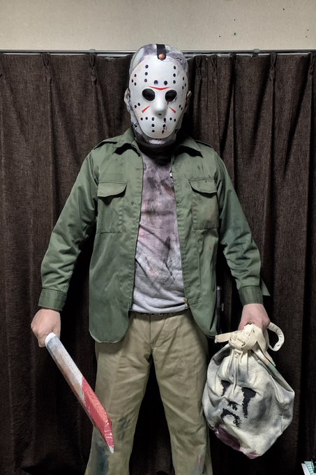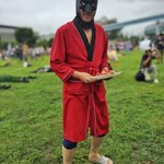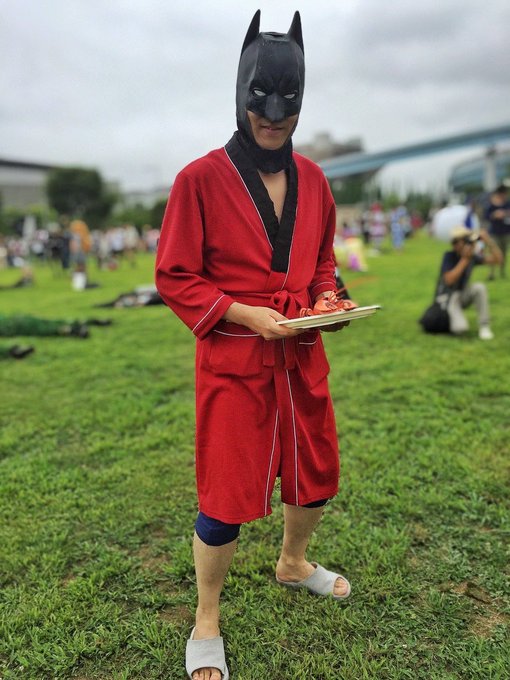 #コスプレイヤー代用選手権 みんな凄いなぁと思って見てたけど自分にもある事を思い出した。 この時はやたら忘れ物が多くて現地調達したんだった。 マスクはドンキで急遽買ったパーティーグッズ。 大胸筋の盛り上がりもTシャツ詰め込んで作ってる。 そして黒パンツは女性用ショーツ。