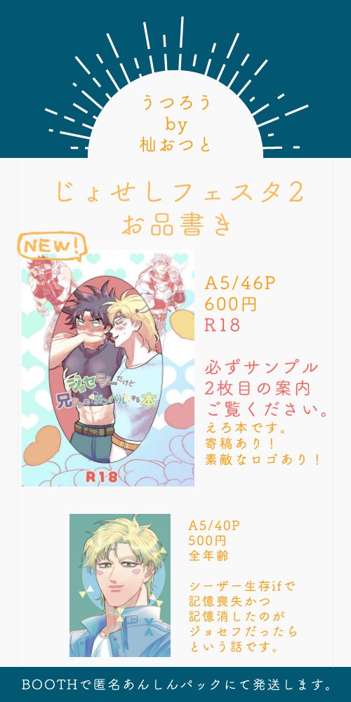 #じょせしフェスタ サークル「うつろう」で参加します。スペースはえ6を頂きました! サクカとお品書き作りました。お品書き低解像度で少しガビっててすみません。 新刊は超素敵な寄稿とロゴ提供あり〼 新刊サンプル→ pixiv.net/artworks/10311… 既刊再掲→ pixiv.net/artworks/10331…