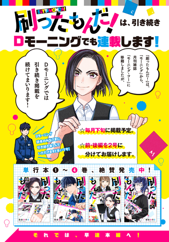 【お知らせ】本日配信のDモーニング52号に『#刷ったもんだ!』54話の前半掲載されております。 新入社員が来たぞ回です。 一週間限定で無料公開されておりますのでよろしければどうぞ! ▶d.morningmanga.jp/viewer/1937/15…