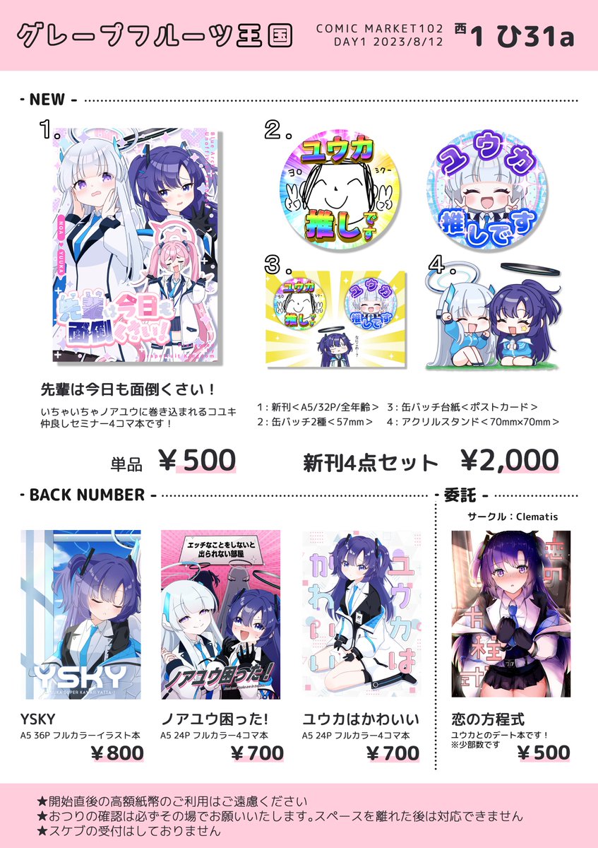 🌟夏コミ C102 お品書きです🌟 1日目 8/12(土) 【西ひ31a グレープフルーツ王国】 でお待ちしてます! ノアユウ 先ユウ 本色々持っていきます🙌 各種サンプルはリプにて! #C102お品書き #コミックマーケット102 #C102