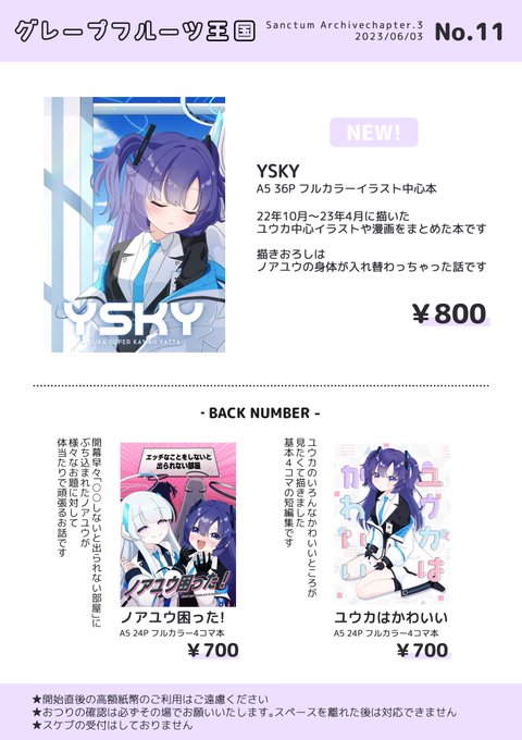 6/3 サンアカ3 【新刊】 22年10月~23年4月までに描いた ユウカ中心のイラストや漫画をまとめた本です! 描きおろしはノアユウの身体が 入れ替わっちゃった話です!👯♀️💖 A5/36P/フルカラー/800円 グレープフルーツ王国/スペース:No.11 ▼通販リンク melonbooks.co.jp/detail/detail.…