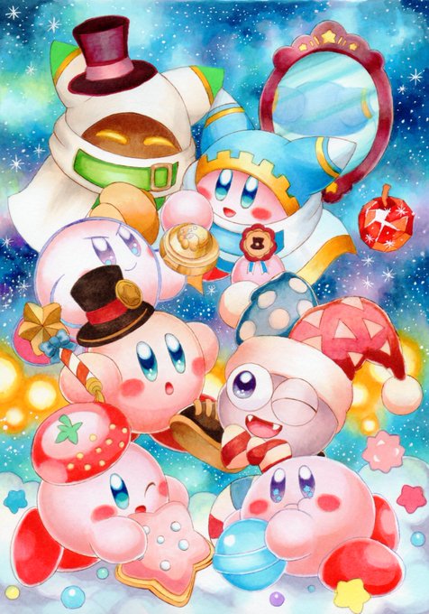 #星のカービィスターアライズ #カービィ #コピック 星のカービィスターアライズ3周年おめでとうございます!🎉 なんとか間に合った…!!恐らく過去最多のキャラ数です。 スタアラは神とか神官とかシスター、神聖なイメージなのでステンドグラス風のイラストにしてみました。