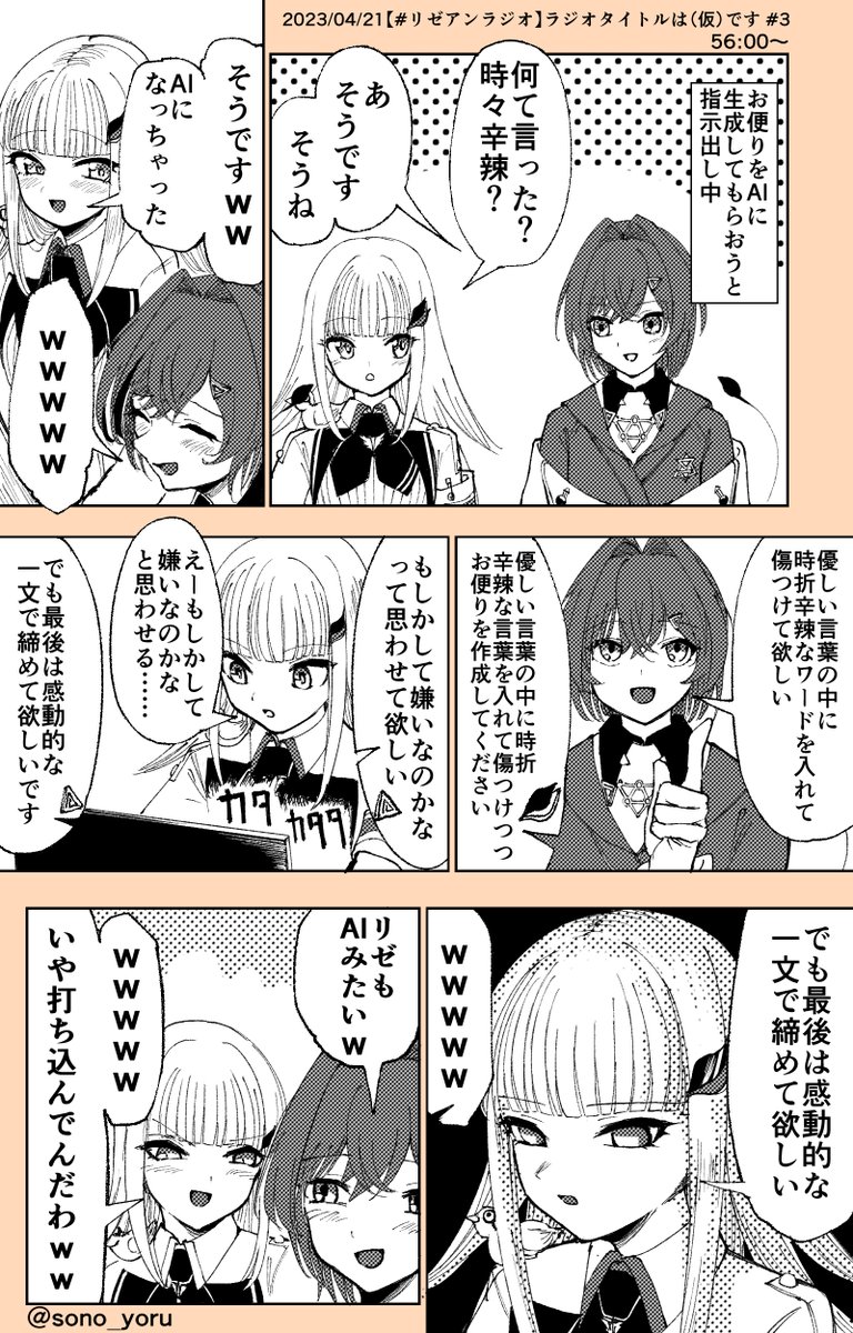 リゼアンラジオ第三回のChatGPTで遊ぶところが良かったという切り抜き漫画です #リゼアンラジオ #ヘル絵スタ #絵ンジュ