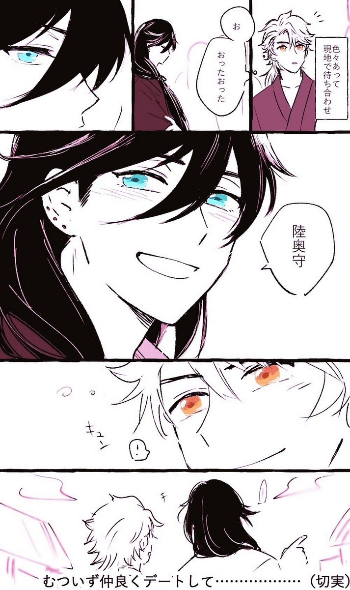 むついず万屋街デートを目撃したい‼️ らくがきでごめんなさいなんだけど 待ち合わせでむつが遠目に見つけて声かける前に気配で気づくかねさん、嘘!?ってくらいの笑顔向けてほしい 付き合う前なら絶対向けないような笑顔をね恋刀になったから見せてくれる表情をねいっぱい見せてほしいの…(一息)