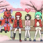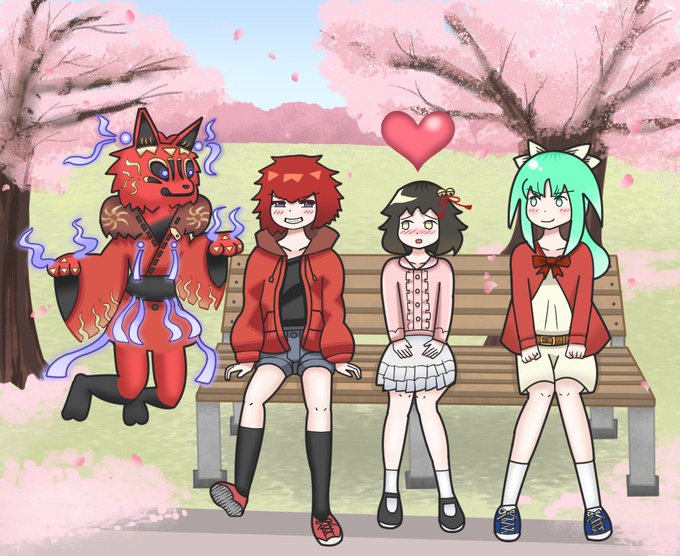 春の公園のベンチに座る子供3人 #創作 #イラスト #イラスト初心者