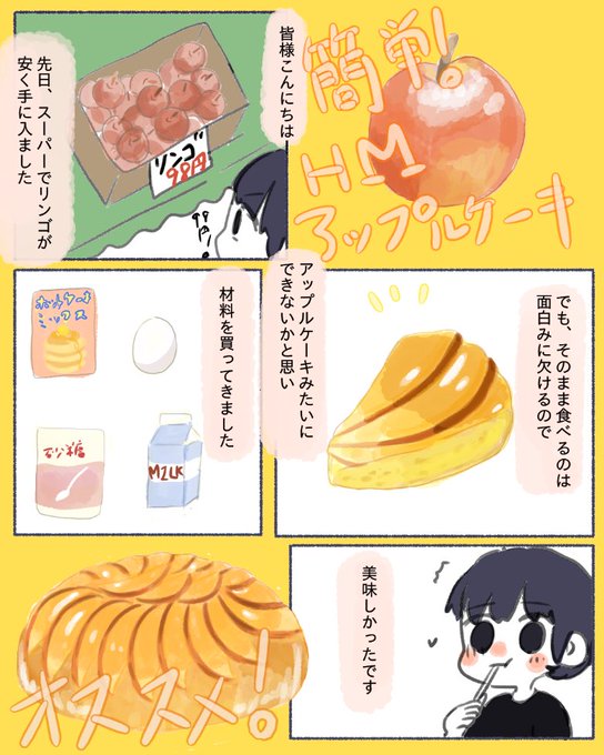 2 6 ホットケーキミックスで簡単アップルケーキおすすめです。 作り方はリンゴをバターと砂糖で煮詰めてホットケーキ一枚分の生地を上から入れて焼くだけ。 詳しくはググって頂ければ似たようなレシピが出ます( ˘ω˘ )スヤァ #漫画が読めるハッシュタグ #漫画 #日常漫画 #エッセイ #エッセイ漫画 #グルメ 22/12/30 22:12