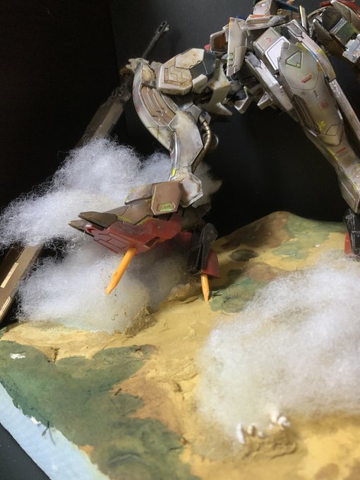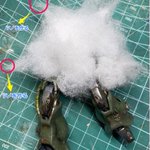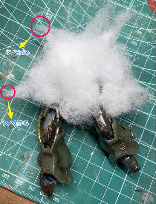 #ガンダム #ガンプラ好きとつながりたい #特殊効果 先日作ったガンダム用に爆破ザクを作成 1:真綿を丸く木工ボンドで結構多めに丸く作って貼る 2:爆破効果を出す為、ケープのスーパーハードを吹きつける 3:指でツノを数箇所作る 4:乾燥させて完成 な感じで後は色を塗ります ご参考迄に…