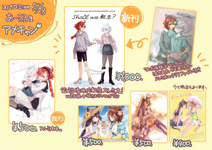 お品書き+見本1:5/3 スパコミ1日目『アメチャン』> スペースはあ−33a、新刊は12話後現代転生スレミオ本です! ノベルティとして、転生漫画の手描き原稿入りのケモ耳パーカースレミオのクリアファイルが付きます! 既刊のスレミオ本と🐎娘本も持っていきます。どうぞよろしくお願いします🙏✨