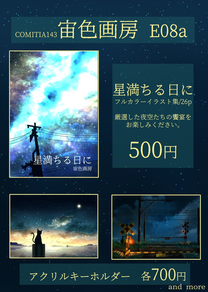 #コミティア143 のお品書きです! 新作の夜空イラスト集とアクリルキーホルダー、あとはポストカードと既出のグッズ少々を持っていく予定です~ 新作は特に自信のある仕上がりなので、是非E08aにお立ち寄りください! #COMITIA143 #コミティア