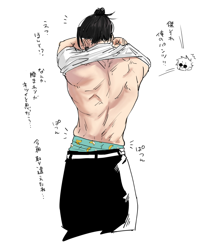 何回かアニメ見返してたら泣きすぎて頭痛くなってきたから寝ようね…開放的なシャワールームの背中が脳裏に焼き付いたから前に描いた背中 パンツ取り違えてぱつんぱつんパンツなすぐるの夏五(再掲)