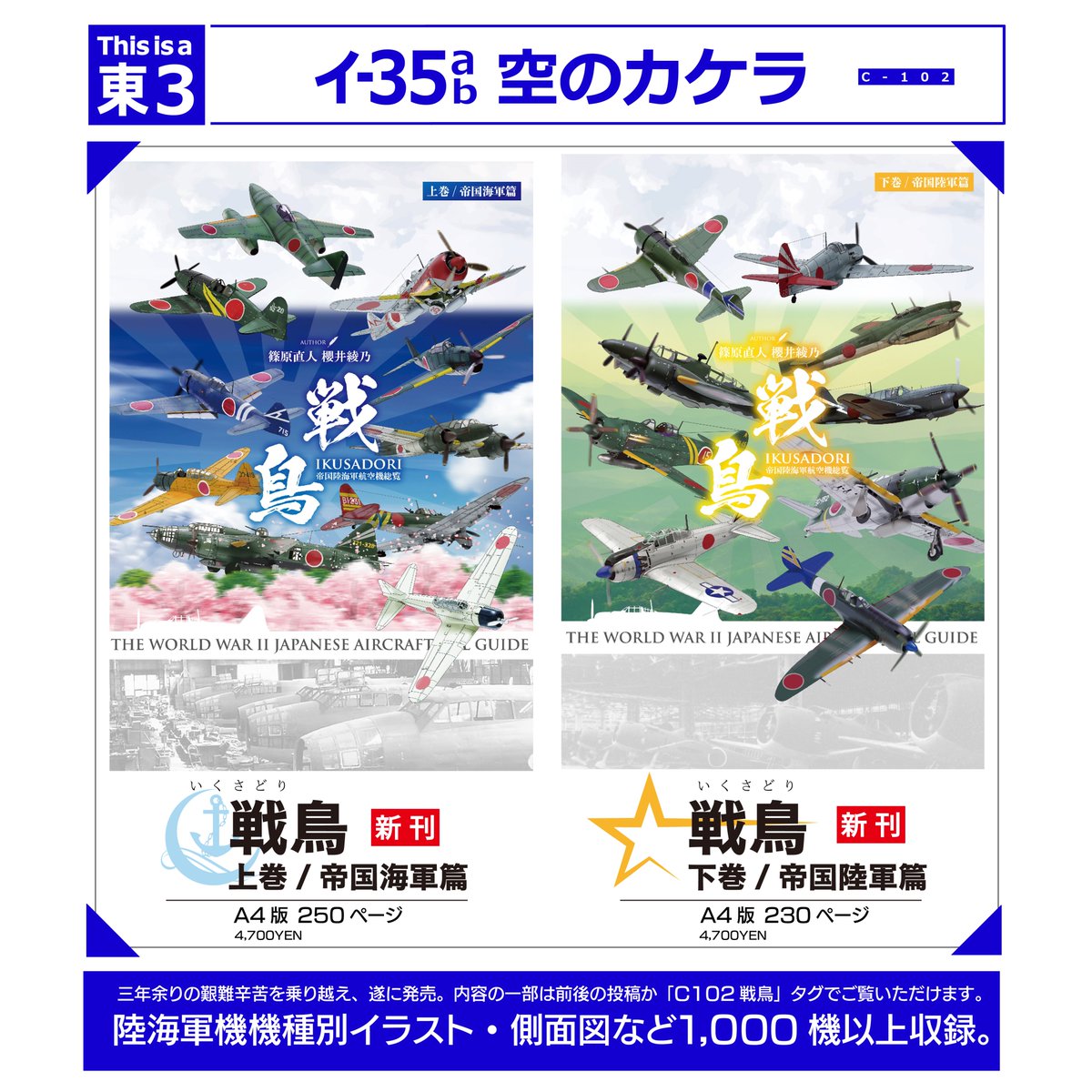 上下巻合わせて1000機以上の大戦機カラーイラストを収録。三年余りの艱難辛苦を踏破し遂に発売。内容の一部は前後の投稿か「戦鳥立読み」タグでご覧いただけます。 #C102 #C102お品書き #C102メカミリ #C102戦鳥 #C102戦鳥立読み #C102新刊 #お品書き pixiv.net/artworks/11046…