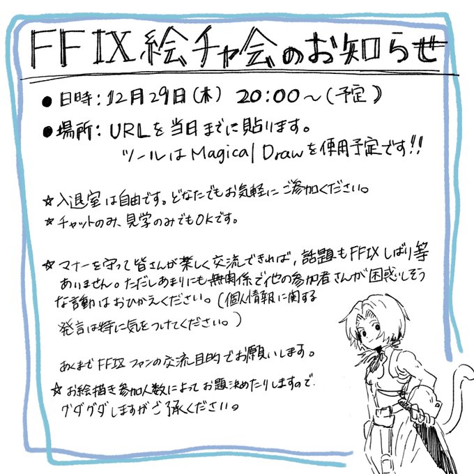 FF9 お絵かきチャット会やります! 日時 12月29日(木) 20:00-(予定) 場所 後日URLを貼ります。 どなたでもお気軽にご参加ください!