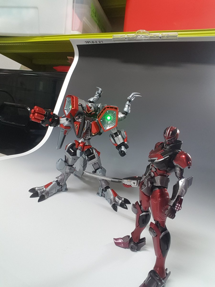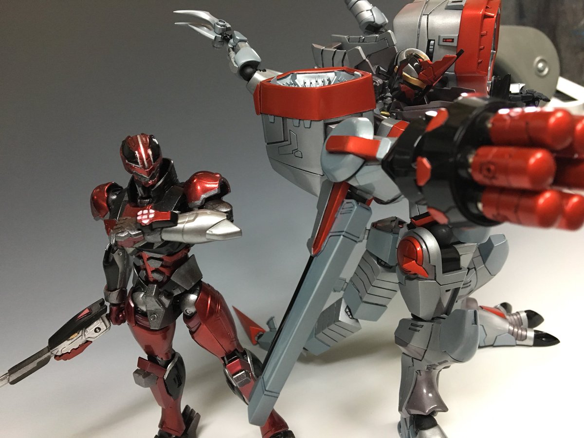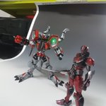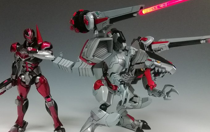 使い魔Aさんのフルスクラッチ ブイレックスが完成したと聞き、便乗して作ったタイムファイヤーを持って一緒に撮影してもらいました!差し替えなしで変形するのにビックリ 「レックスレーザー!」 「リボルバーミサイル!」 「マックスブリザード!!」 #ニチアサフィギュア改造部